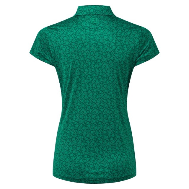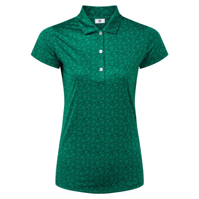 FJ. FootJoyn naisten pikee ProDry Stretch Lisle kankaalla. Materiaalissa iholta kosteutta siirtävä tekniikka, helppohoitoinen – rypistymätön ja nopeasti kuivuva. Kukkaprintti, väri forest green. Edessä napitus ja kauluksissa sama printtiväri. Takana FJ logo. 88% polyester ja 12% elastaani.