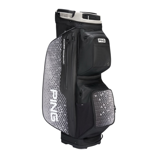 Ping kärrybägi. Pingin uudelleen suunniteltu Pioneer Monsoon vedenpitävä kärrybägi painaa 2,9 kg. Löytyy useissa eri väriyhdistelmissä. Jakajia on yhteensä 15, joista yksi isompi putteria varten. Taskuja on yhteensä 9. Edessä olevaa pientä etutaskua (brodeeraus mahdollisuus) lukuunottamatta taskujen vetoketjut ovat vedenpitävät. Sivulla olevat täyspitkät vaatetaskut laajenevat tarvittaessa tilavammaksi (tarroilla kiinni bägin rungosssa). Paikka löytyy sateenvarjolle ja bägi on helppokiinnittää kärryyn.